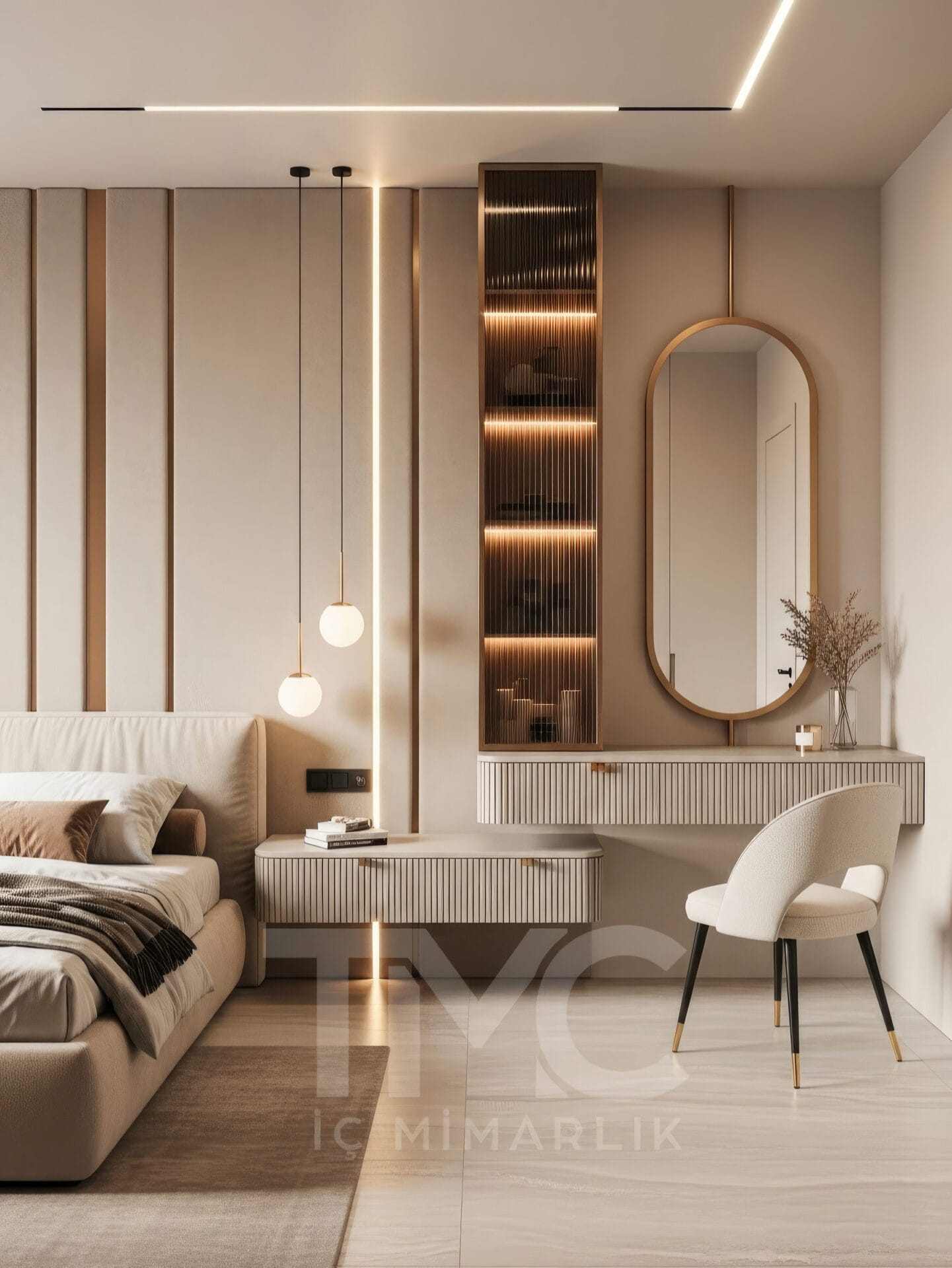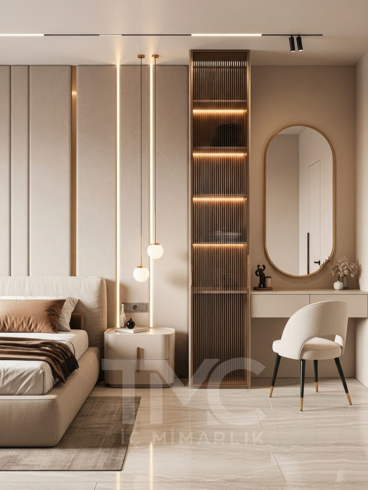 Bu yatak odası tasarımında amaç, günlük yaşam konforunu artırırken aynı zamanda estetik ve zamansız bir iç mimari deneyimi sunmaktır. TMC Mimarlık tarafından geliştirilen özel tasarım yaklaşımı sayesinde her detay kullanıcı ihtiyaçlarına göre planlanmış ve projeye özgü çözümler üretilmiştir.