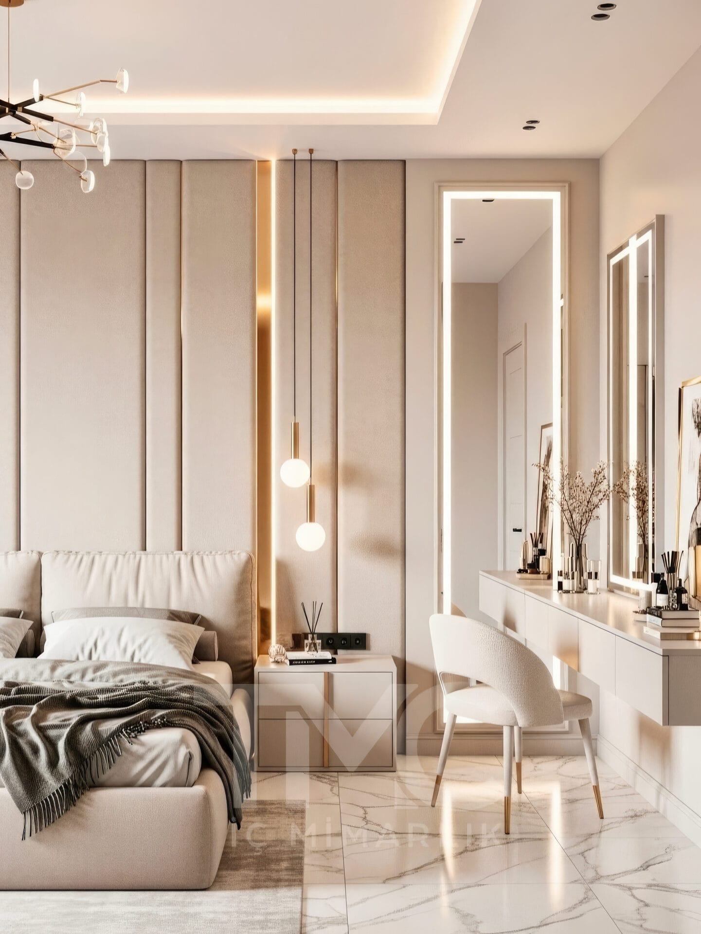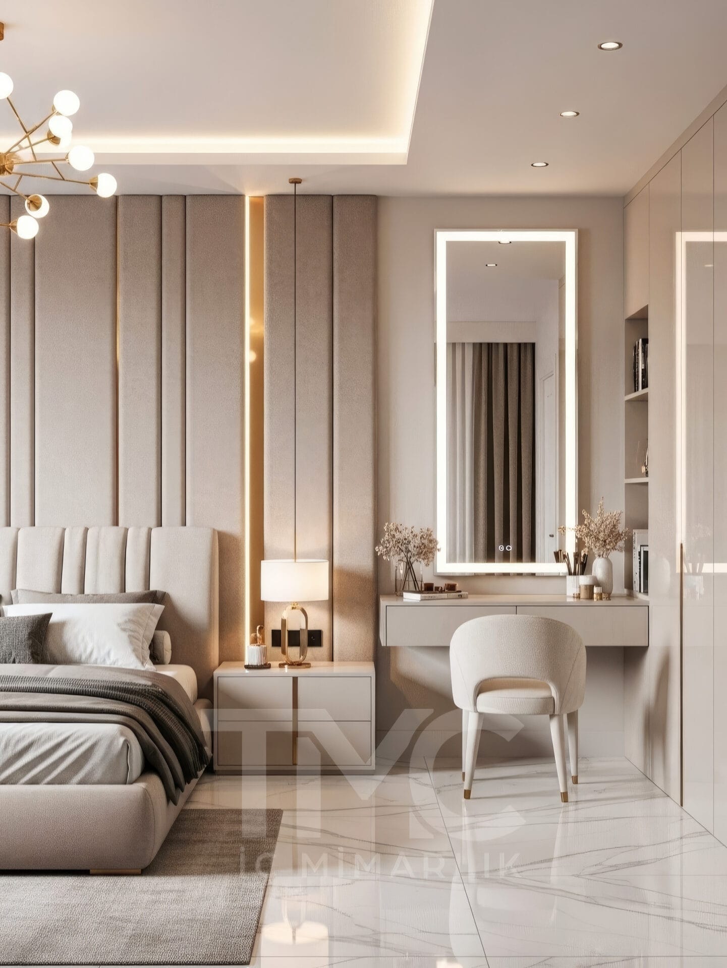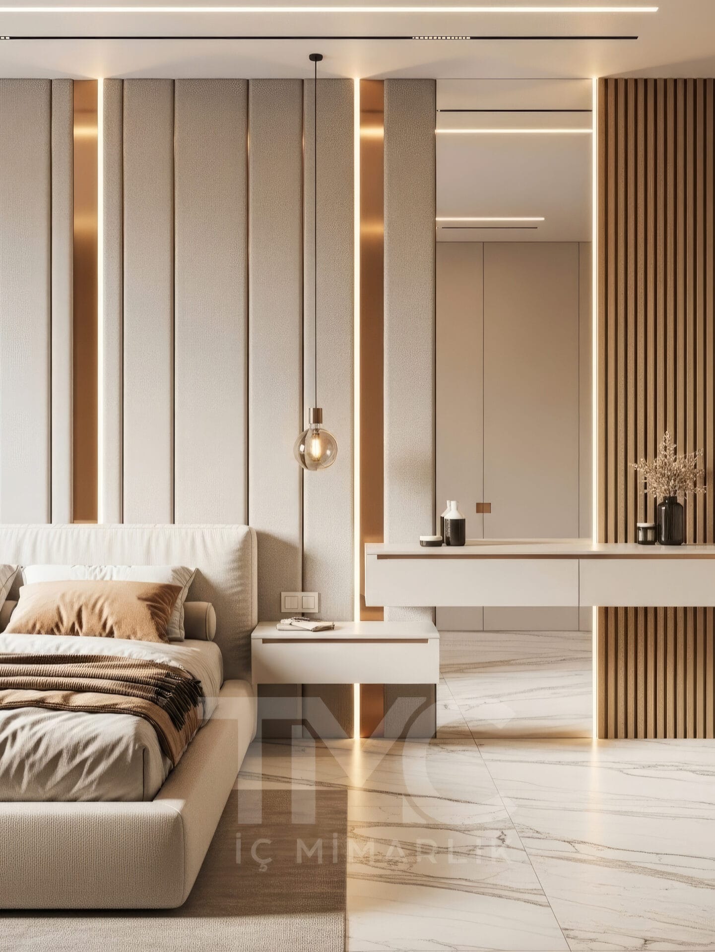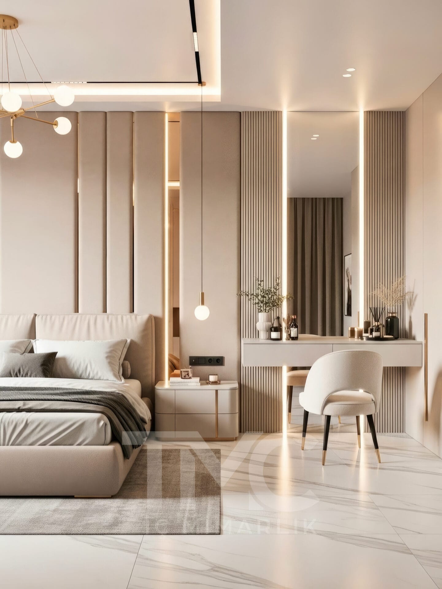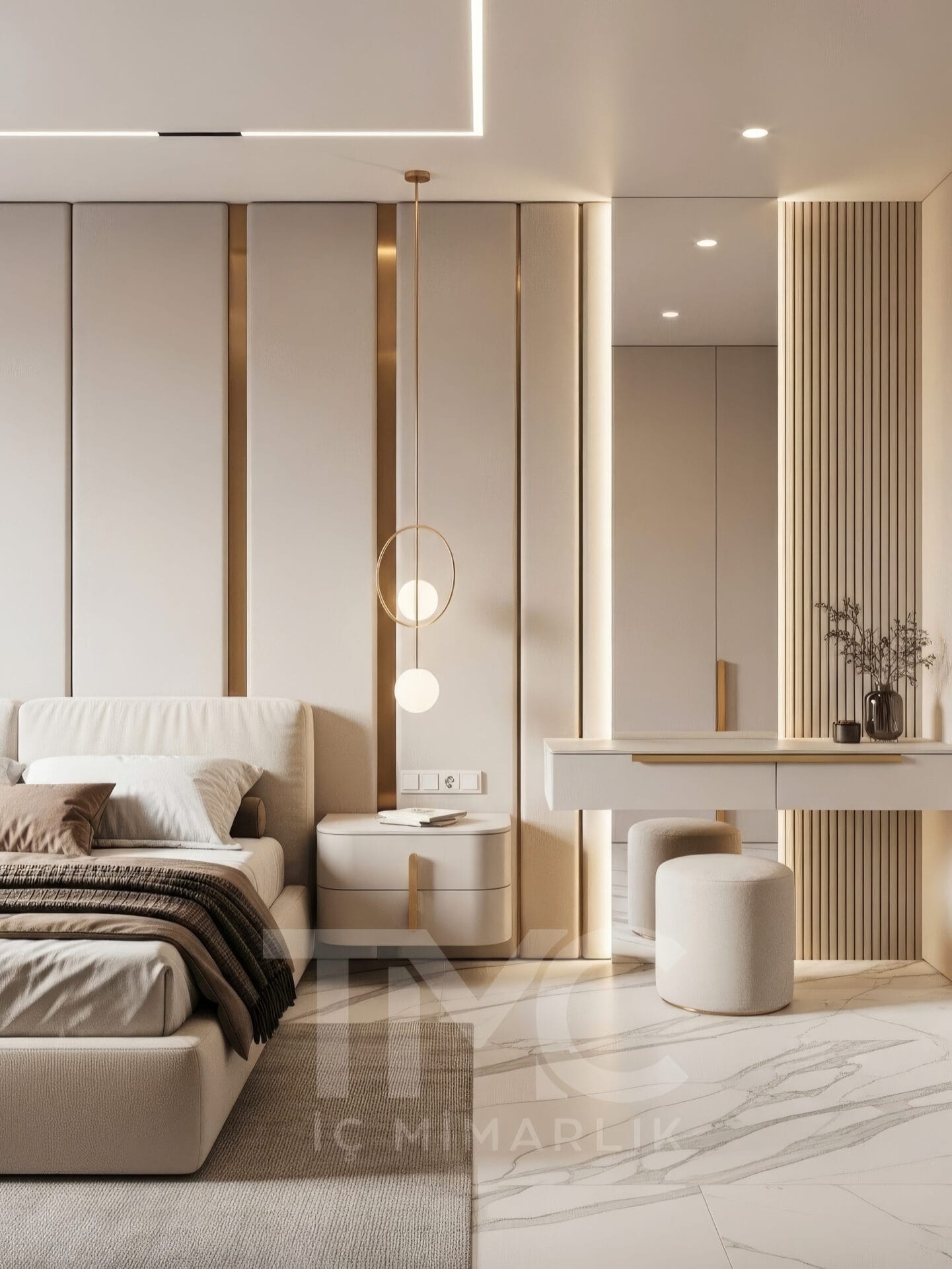Projede kullanılan mermer zemin kaplaması, mekâna ferahlık ve prestij katarken; yumuşak vizon tonları ve gold detay geçişleri tasarımın genel atmosferini sıcak ve sofistike bir hale getirmektedir. Gizli LED aydınlatma hatları ise mekânda dengeli bir ışık dağılımı sağlayarak modern bir ambiyans oluşturur.