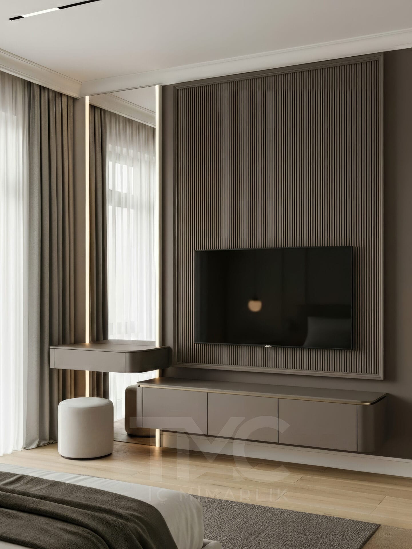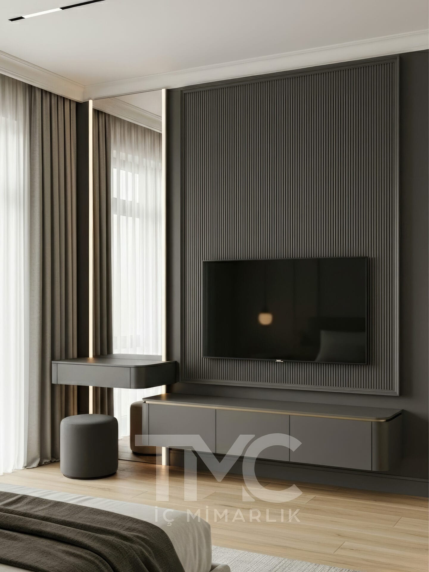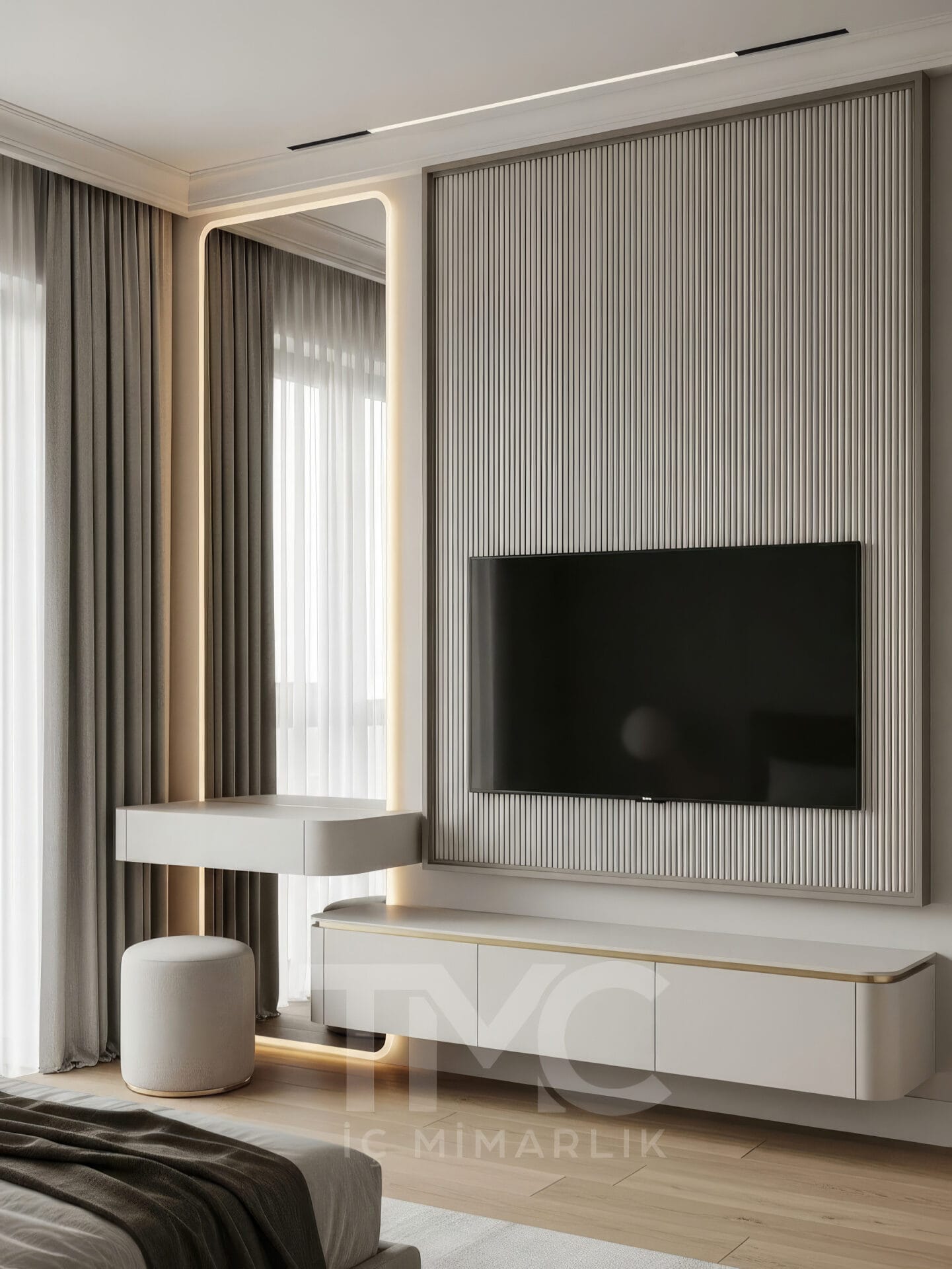 Aura Line TV ünitesi ve entegre makyaj masası tasarımı, modern yatak odaları için estetik ve fonksiyonelliği bir araya getiren özel bir çözümdür. Minimal çizgiler, nervürlü arka panel detayı ve dengeli LED aydınlatma kullanımıyla mekânda sade ama güçlü bir karakter oluşturur.
