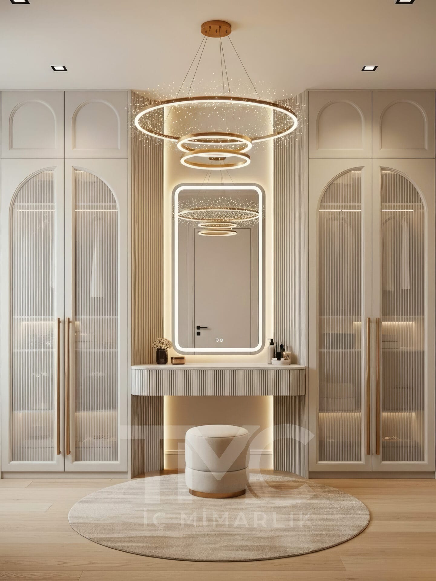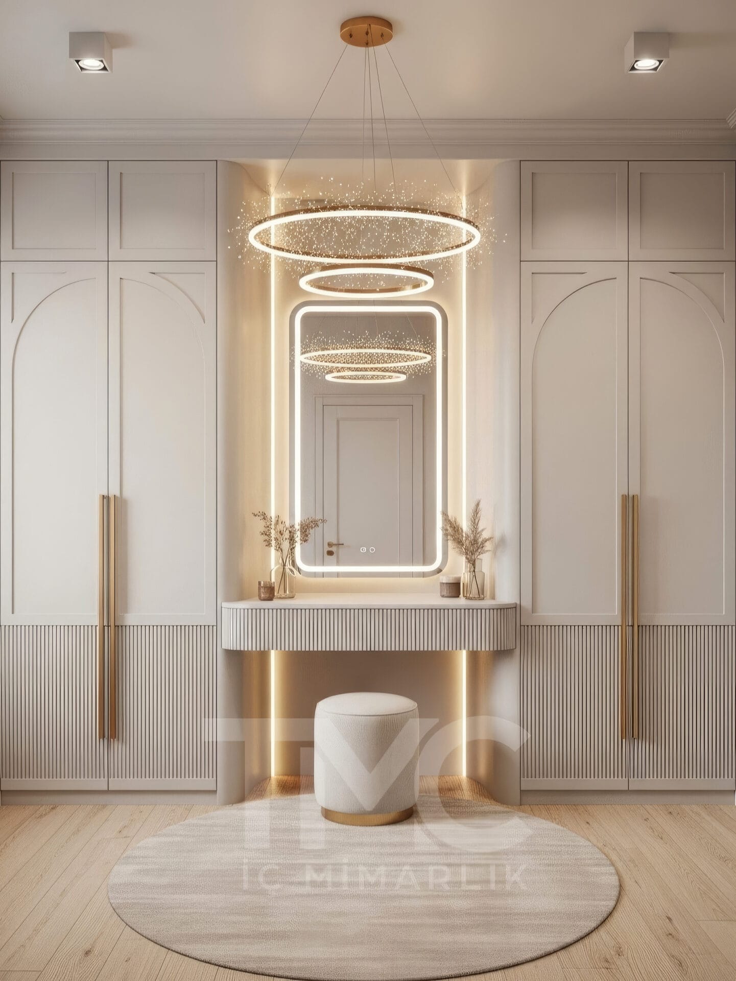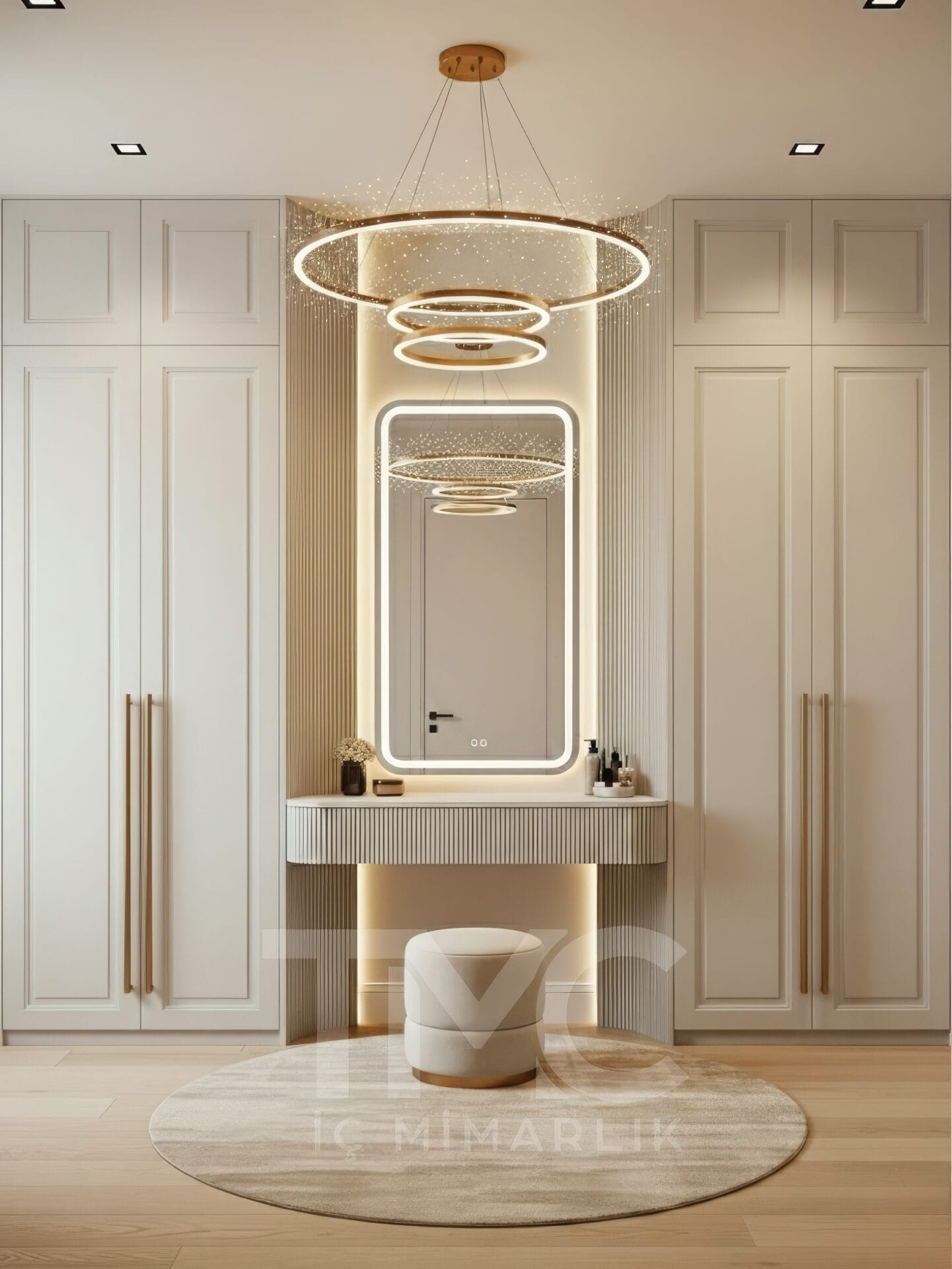 Elif & Kaan Yılmaz için tasarladığımız Golden Aura Dressing Room projesi, modern çizgilerle lüks detayları bir araya getiren özel bir giyinme odası tasarımıdır. Krem tonları, gold detaylı kulplar, dekoratif halka sarkıt aydınlatma ve nervür yüzeyli makyaj masası ile mekânda şık, dengeli ve zamansız bir atmosfer oluşturulmuştur.