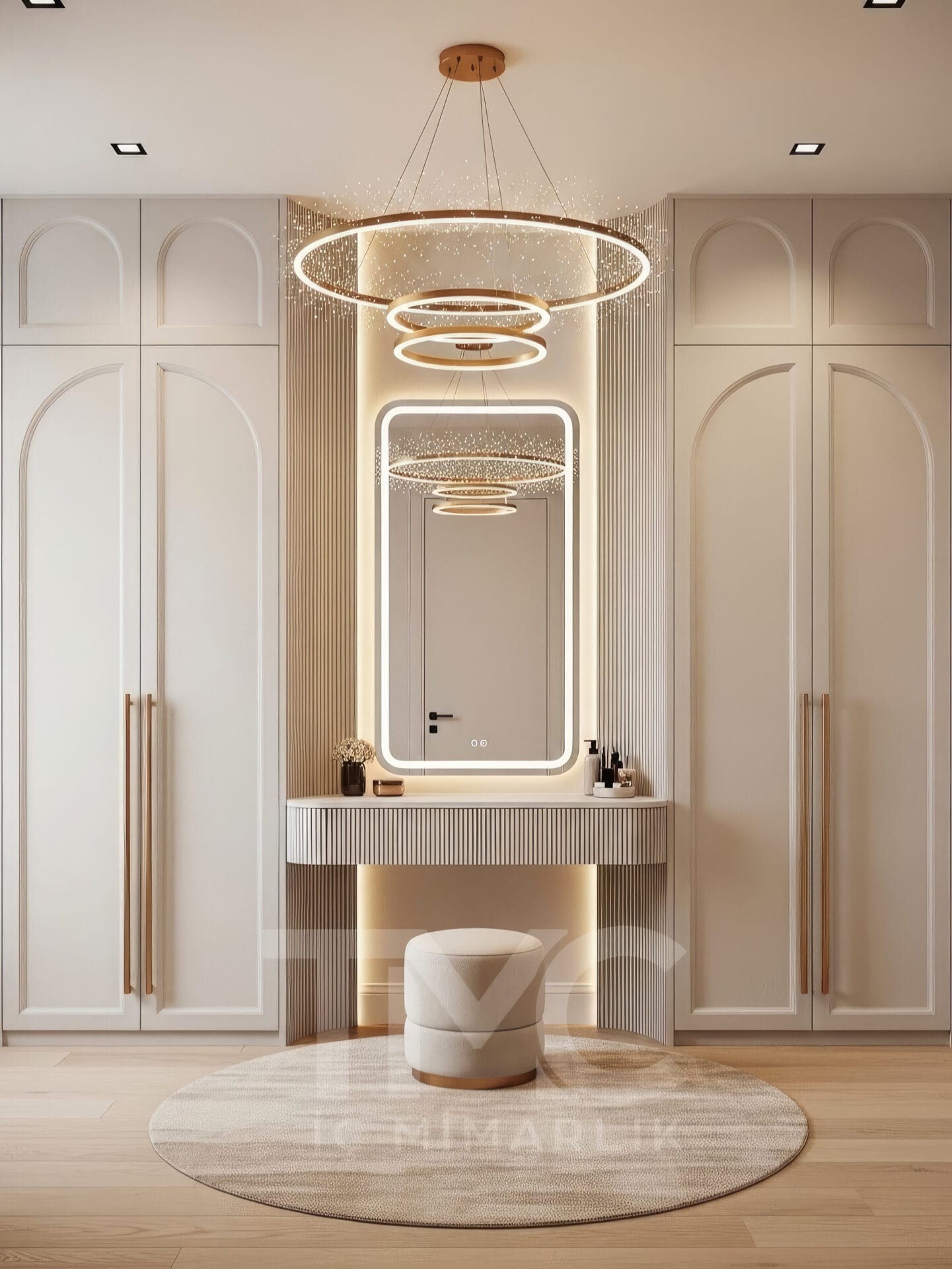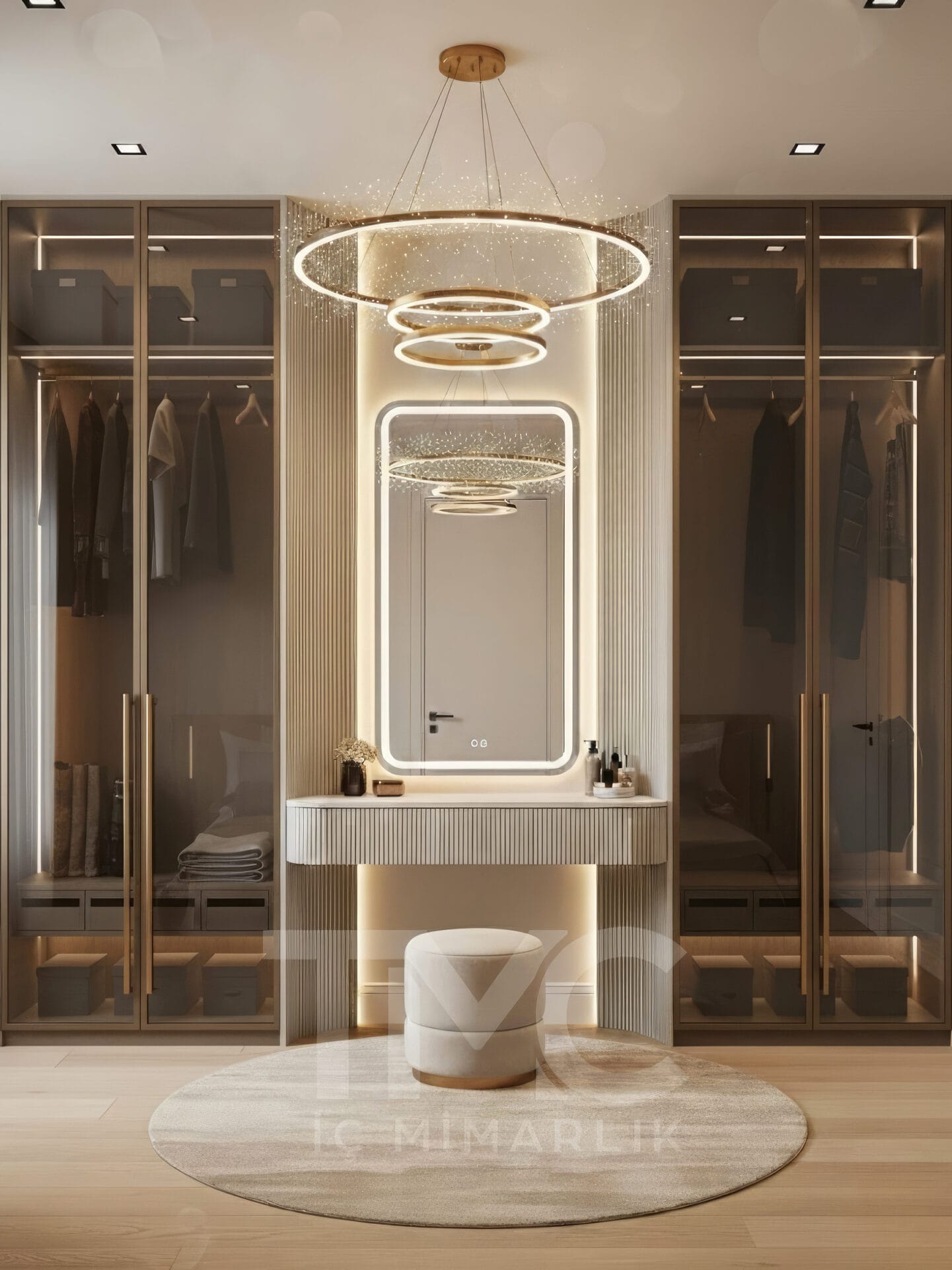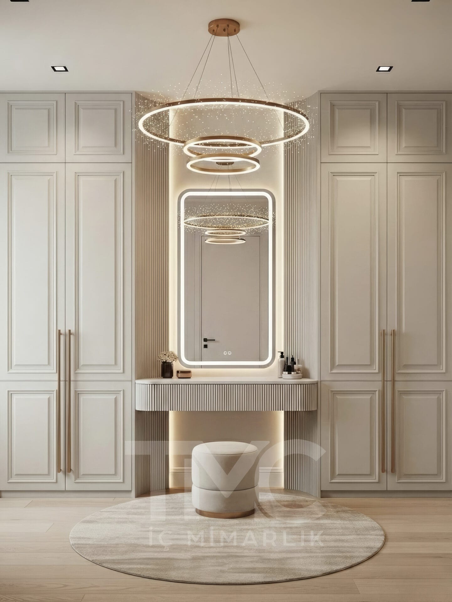 Elif & Kaan Yılmaz için tasarladığımız Golden Aura Dressing Room projesi, modern çizgilerle lüks detayları bir araya getiren özel bir giyinme odası tasarımıdır. Krem tonları, gold detaylı kulplar, dekoratif halka sarkıt aydınlatma ve nervür yüzeyli makyaj masası ile mekânda şık, dengeli ve zamansız bir atmosfer oluşturulmuştur.