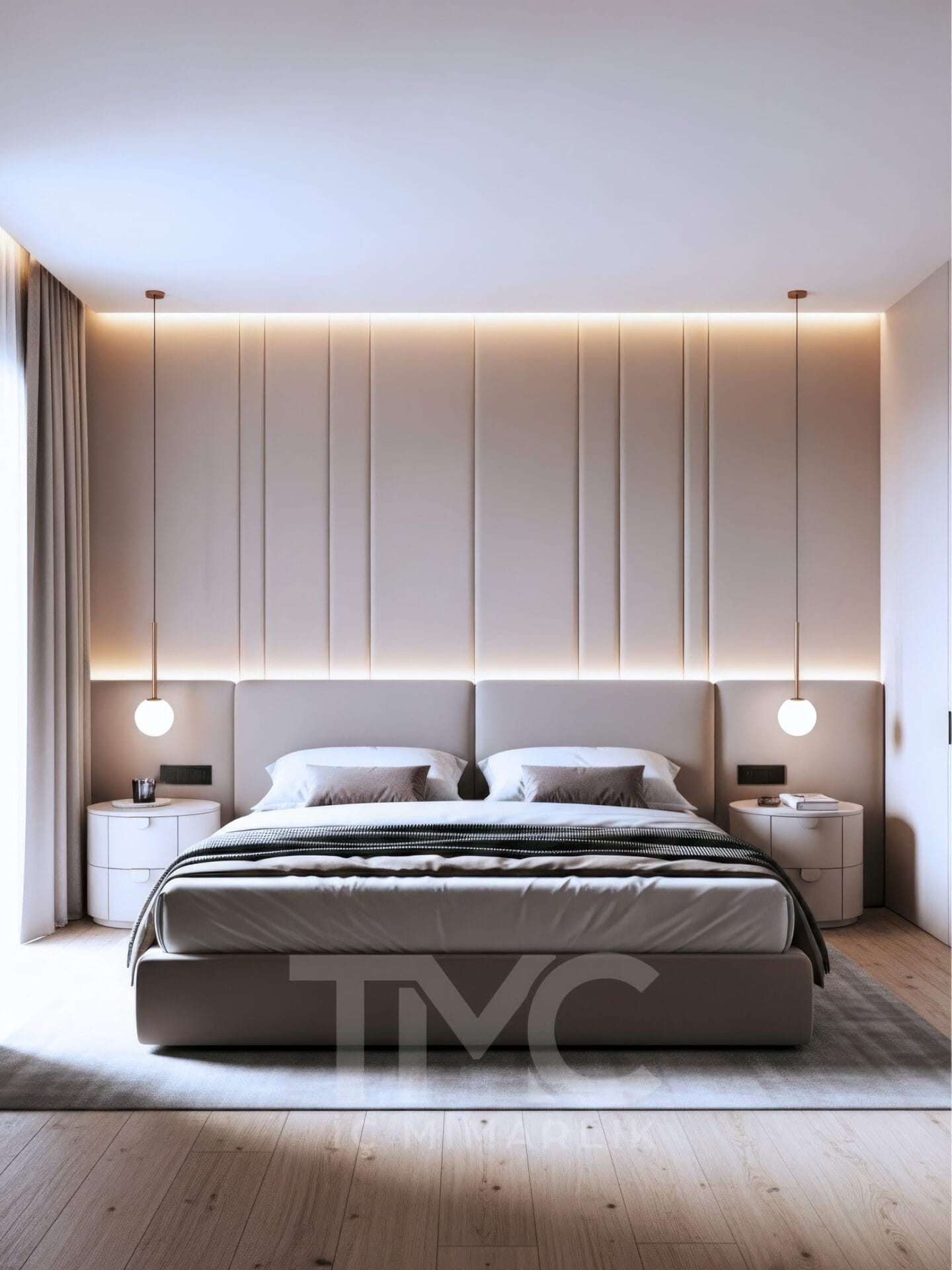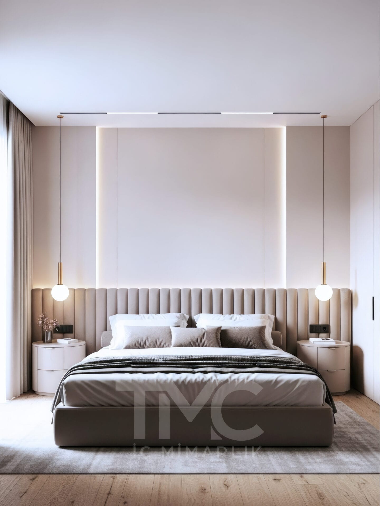 modern yatak odası, lüks yatak odası tasarımı, yatak odası dekorasyonu, özel tasarım yatak odası, iç mimari yatak odası, minimal yatak odası, led aydınlatmalı yatak odası, TMC Mimarlık