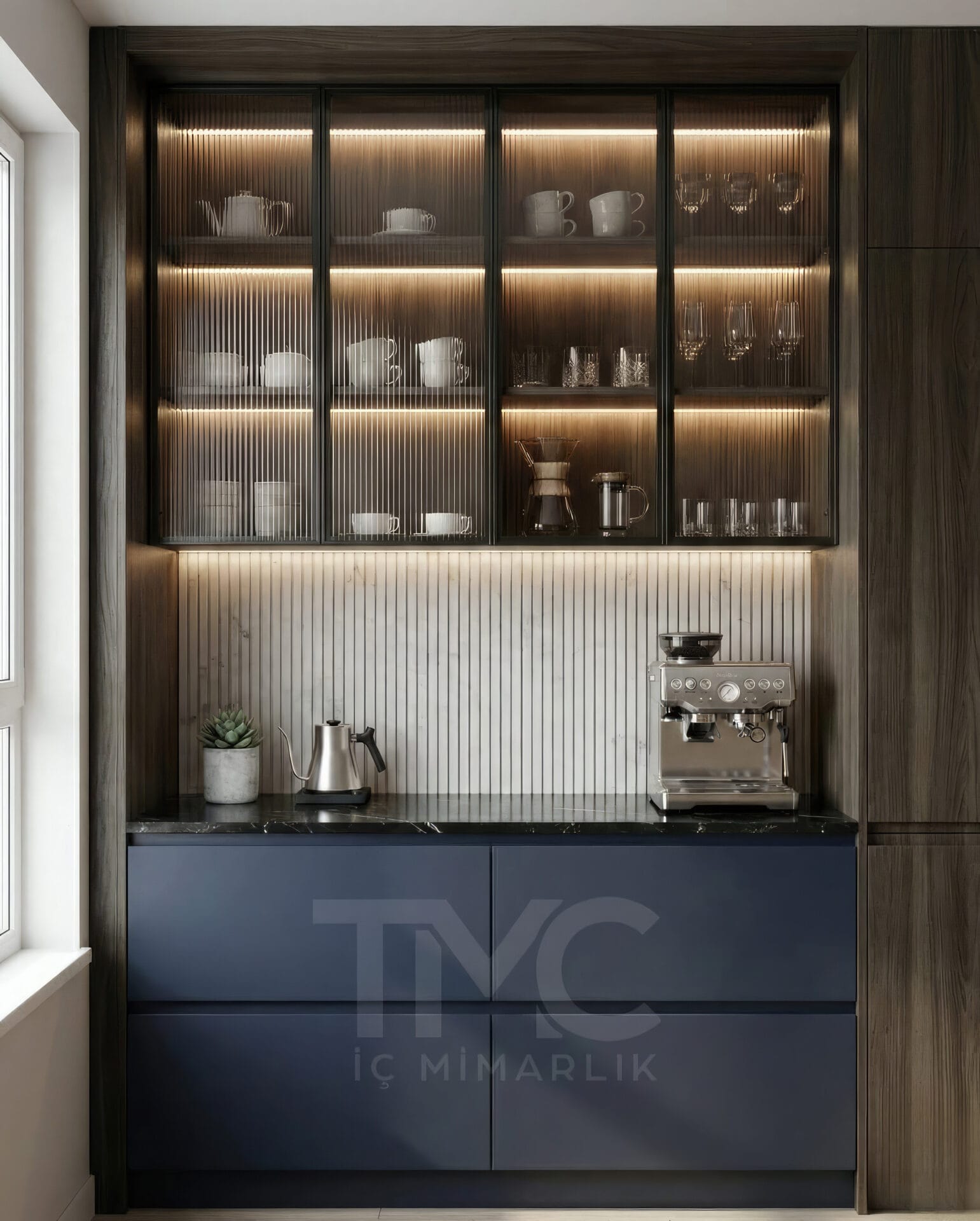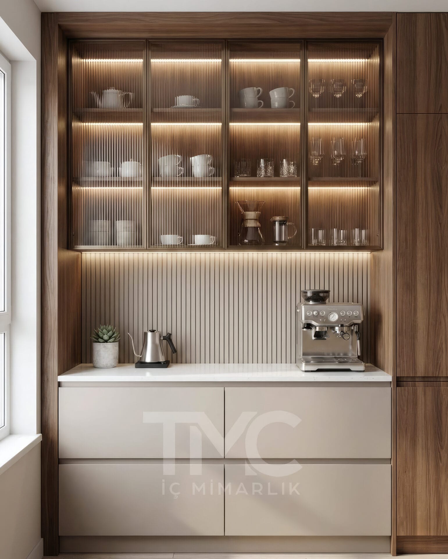 Kartal’daki konut projemiz için tasarladığımız bu minimal kahve köşesi, modern çizgiler ve fonksiyonelliği bir araya getirerek mekâna şık bir karakter kazandırır. Nervür (fluted) cam detayları, sıcak LED aydınlatma ve doğal ahşap dokular sayesinde hem estetik hem de kullanışlı bir kullanım alanı oluşturulmuştur.