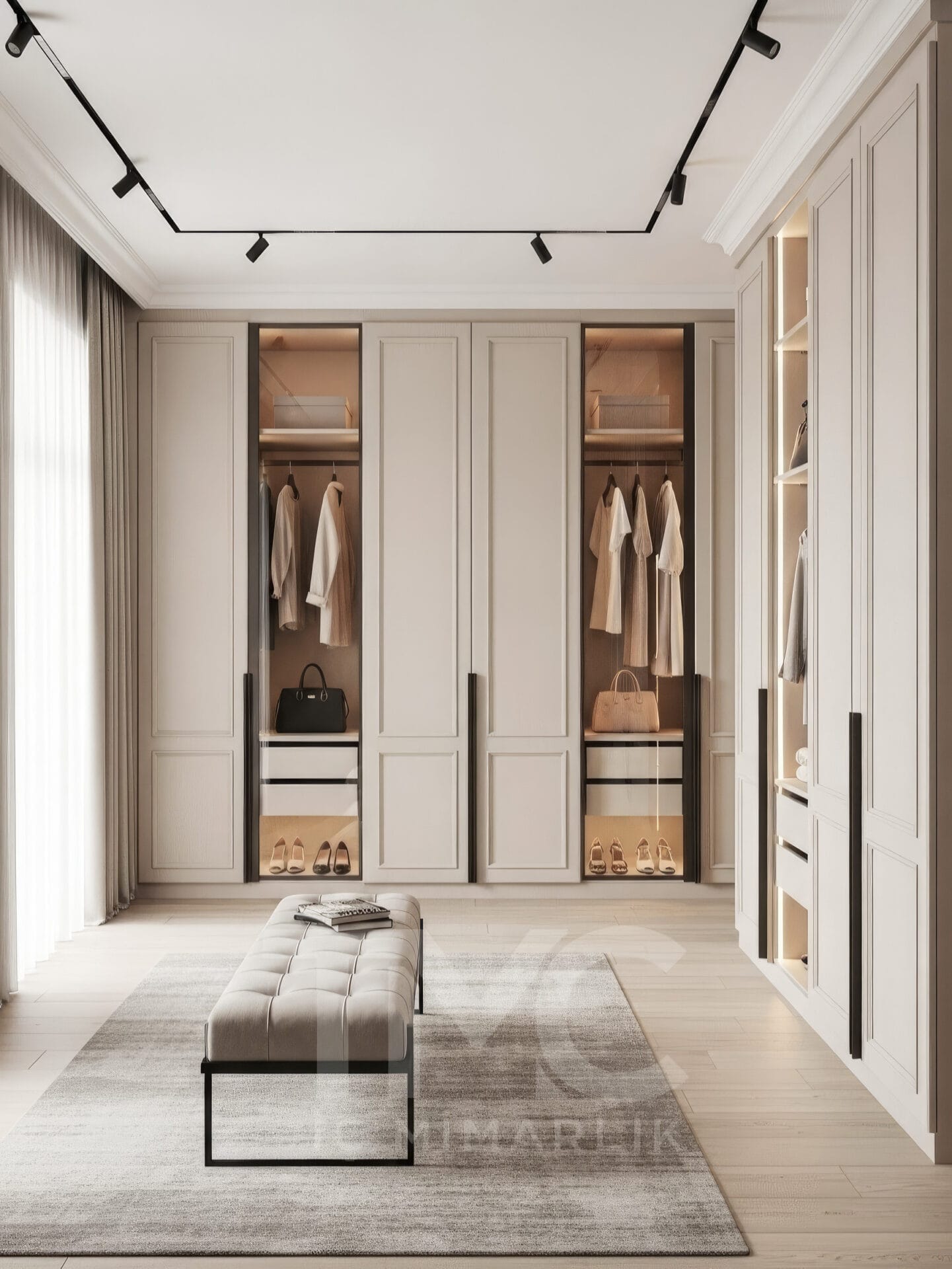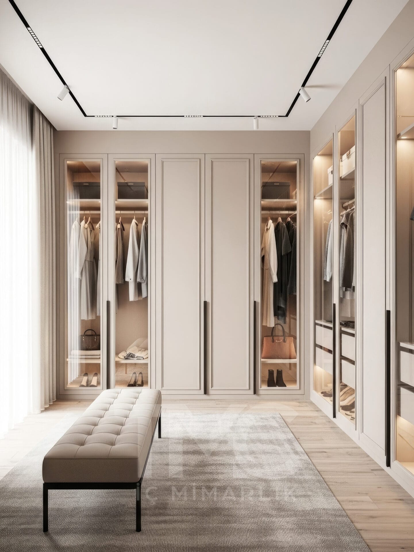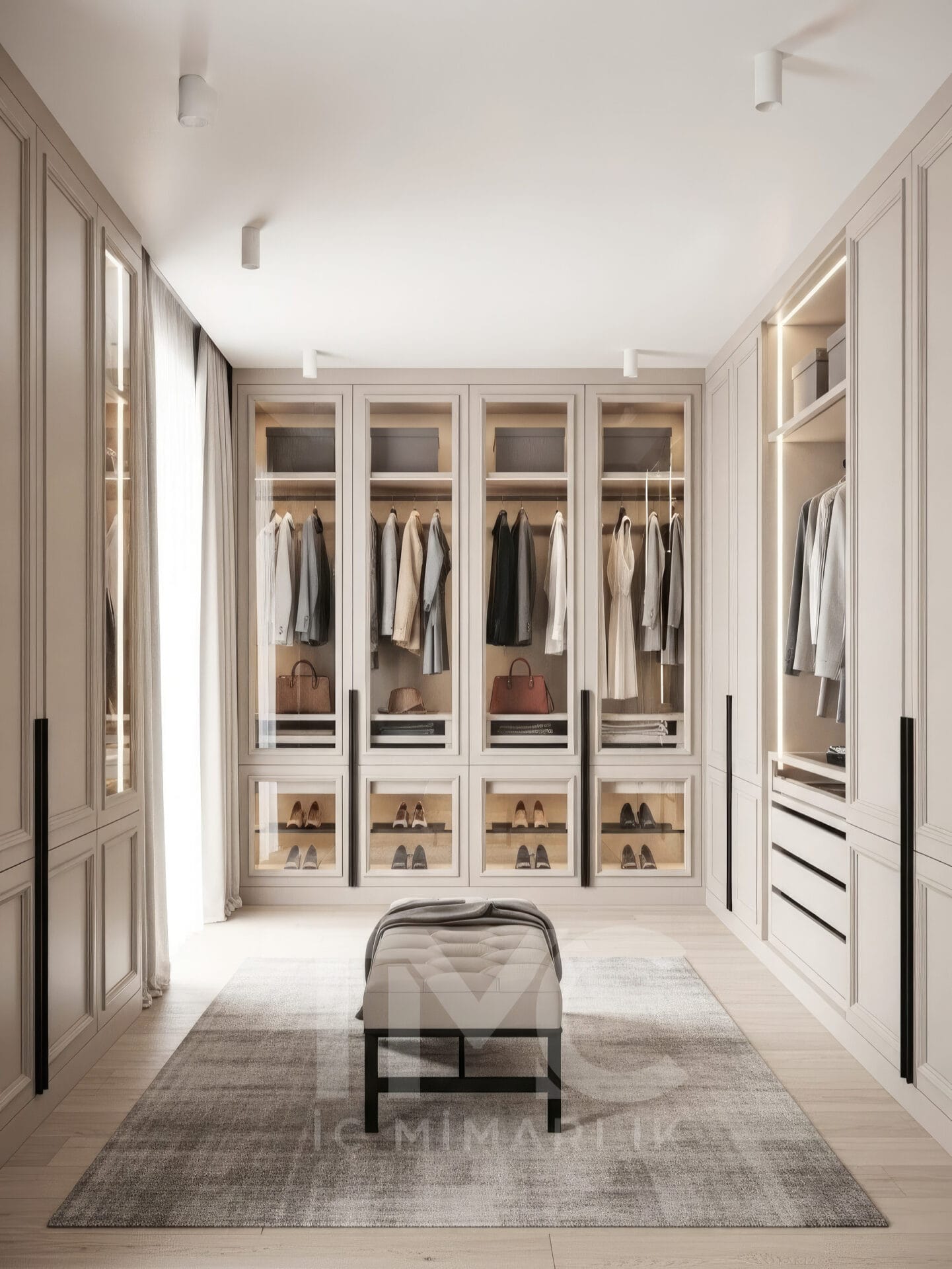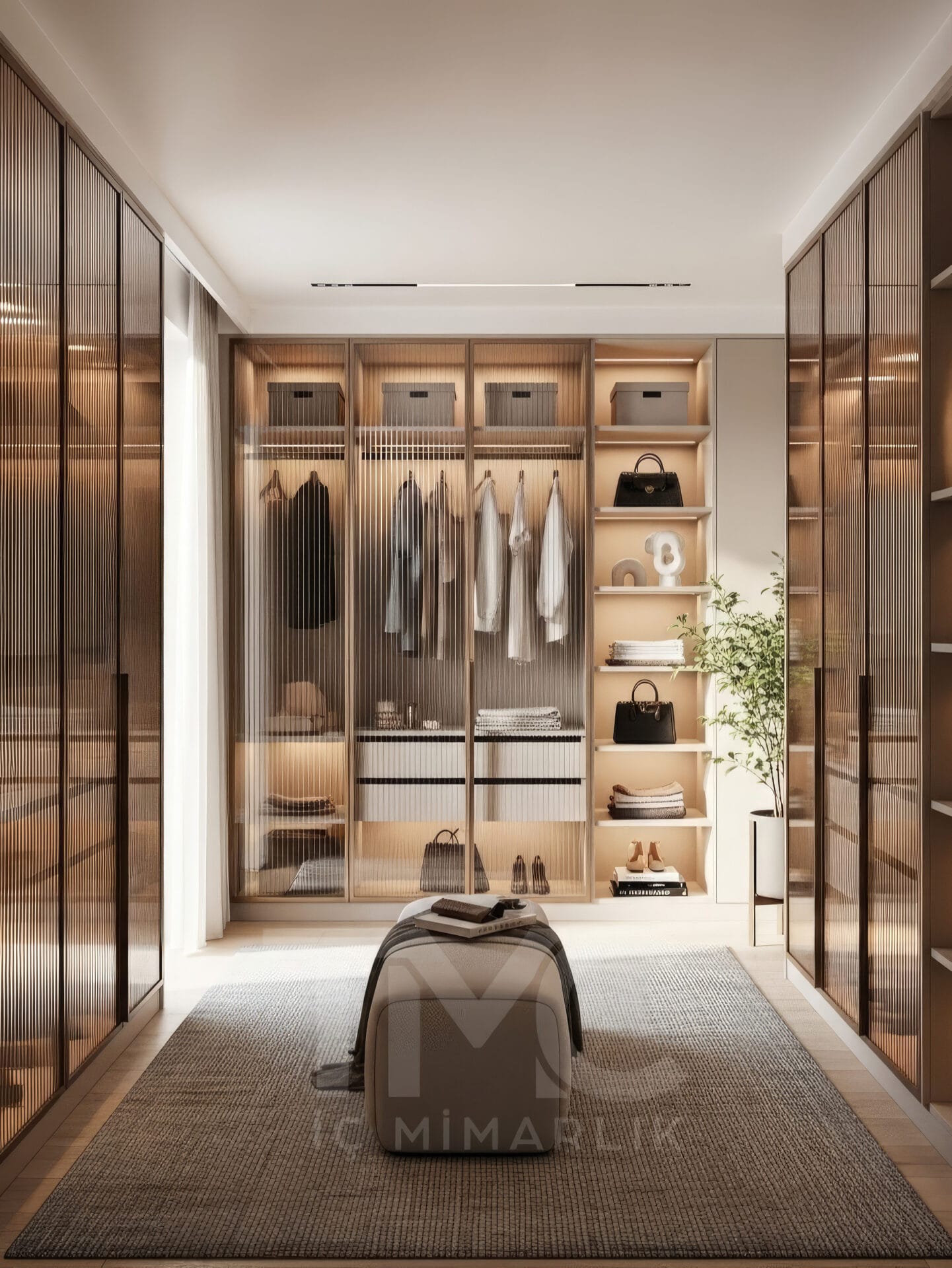 Tasarımın merkezinde yer alan cam kapaklı dolap sistemleri, iç mekânın daha ferah görünmesini sağlarken aynı zamanda kıyafetlerin düzenli şekilde sergilenmesine olanak tanır. Dolap içlerinde kullanılan LED aydınlatmalar, hem görsel derinlik oluşturur hem de kullanım kolaylığı sağlar.