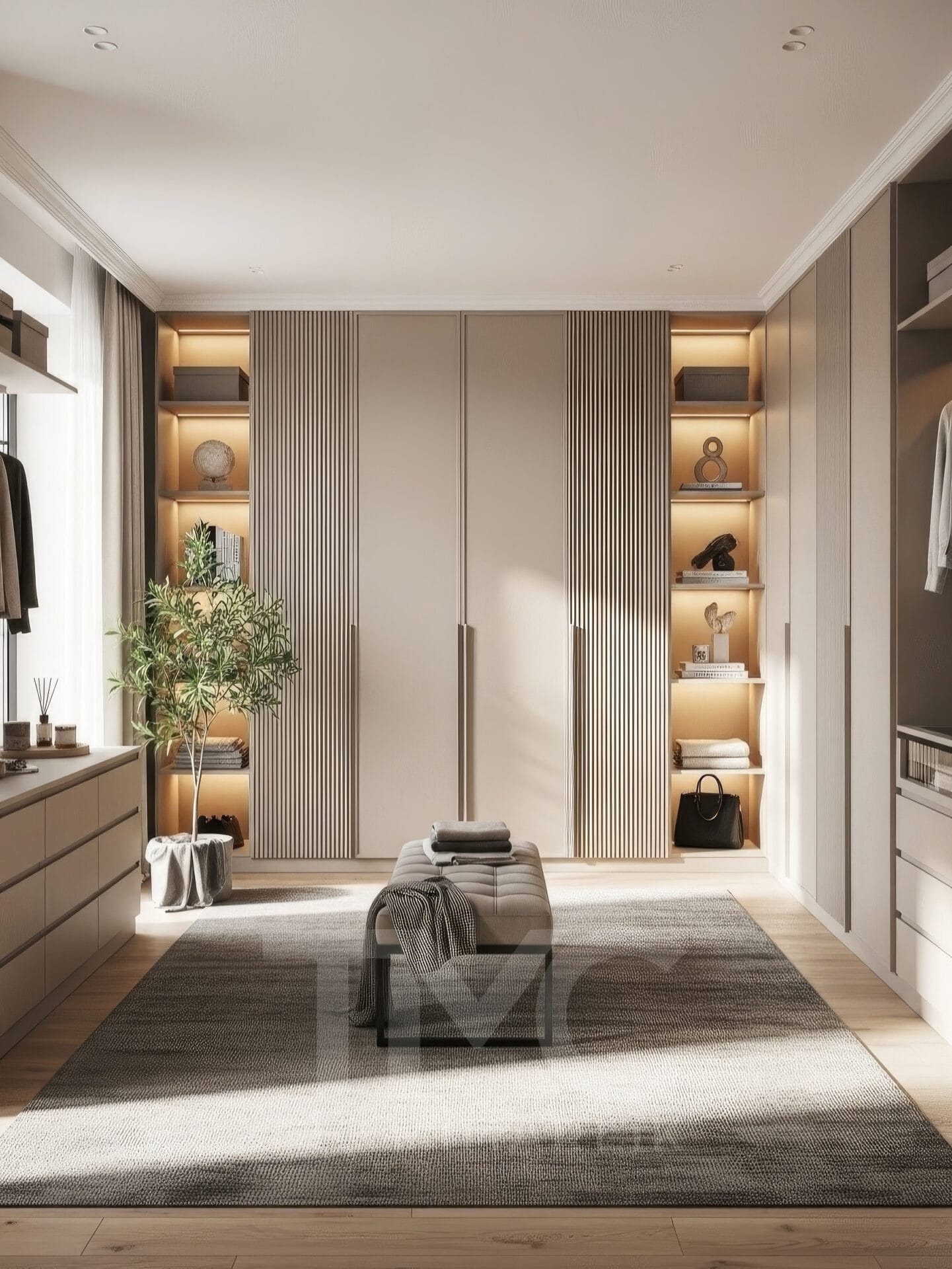 Bej ve açık ahşap tonlarının hakim olduğu renk paleti sayesinde mekan, sade ama lüks bir atmosfer kazanır. Orta alanda konumlandırılan oturma bankı ise giyinme odasının kullanımını daha konforlu hale getirir.