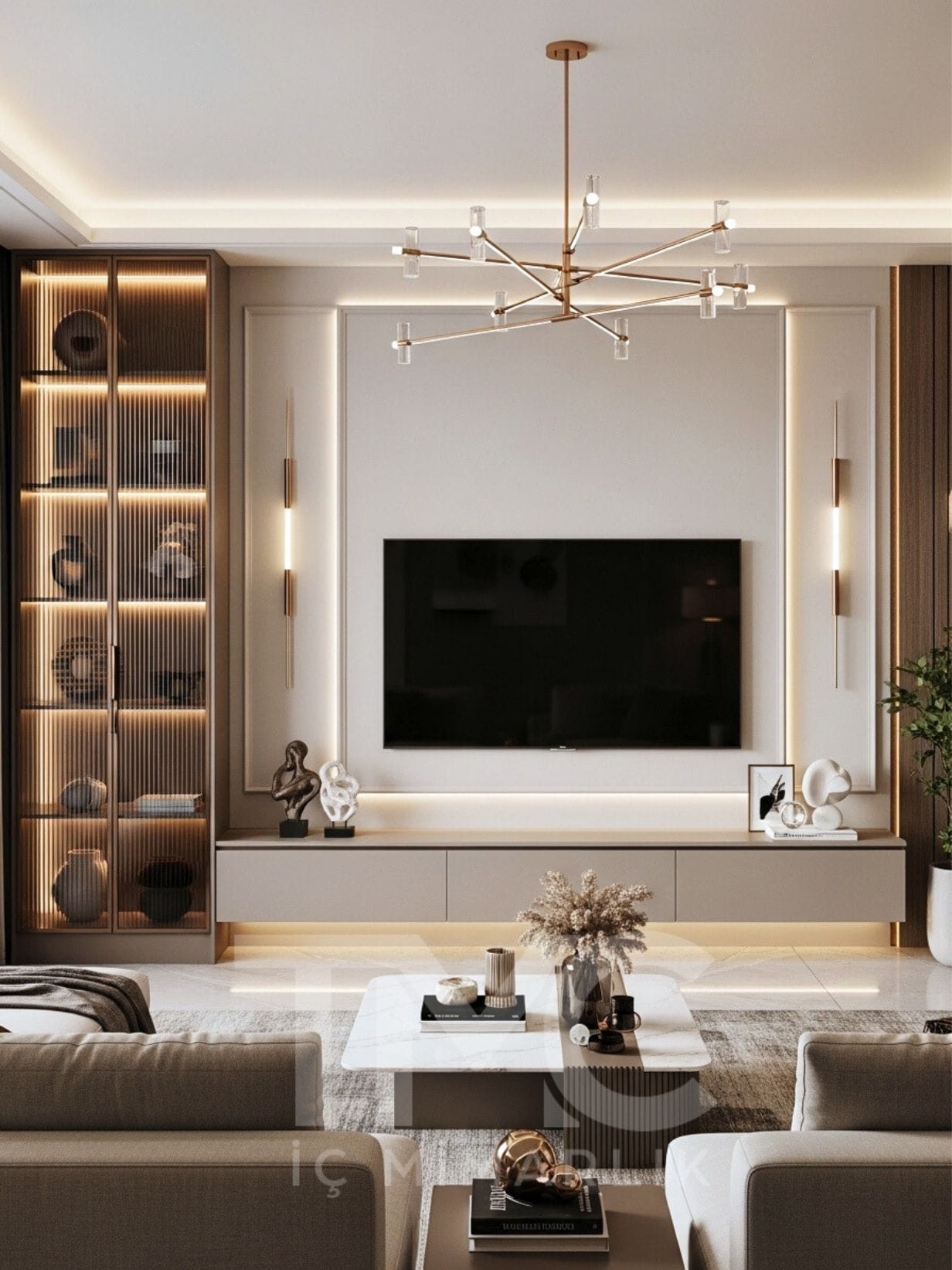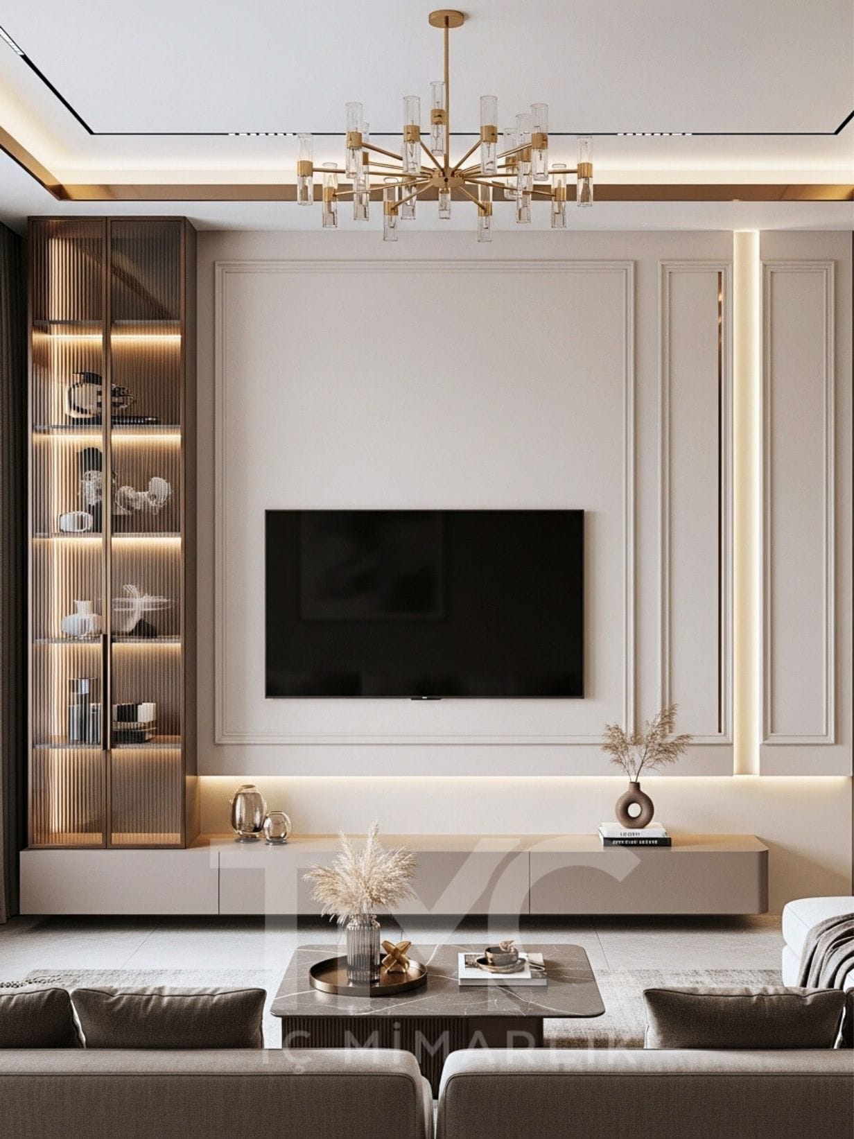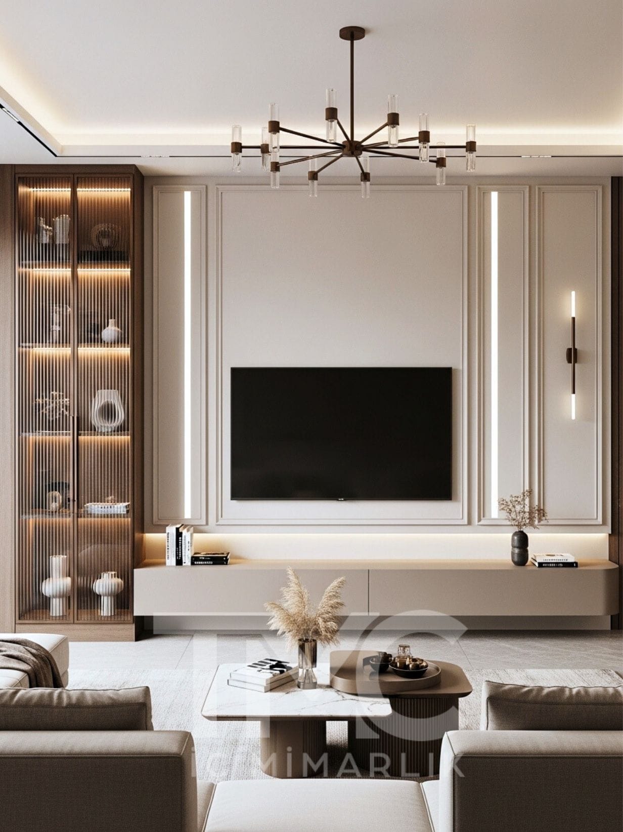 Bu projede modern iç mimarinin sade ve zarif çizgileri, sıcak aydınlatma detayları ile bir araya getirilerek estetik ve dengeli bir yaşam alanı oluşturulmuştur. TV ünitesi tasarımında kullanılan minimal duvar panelleri, bronz tonlu detaylar ve nervürlü cam vitrin uygulaması mekâna hem şıklık hem de derinlik kazandırmaktadır.