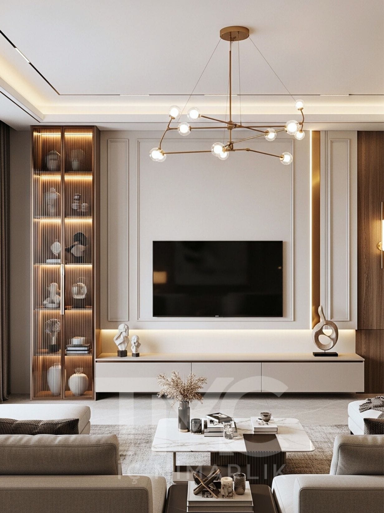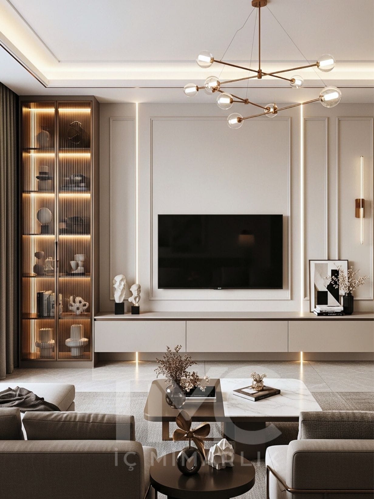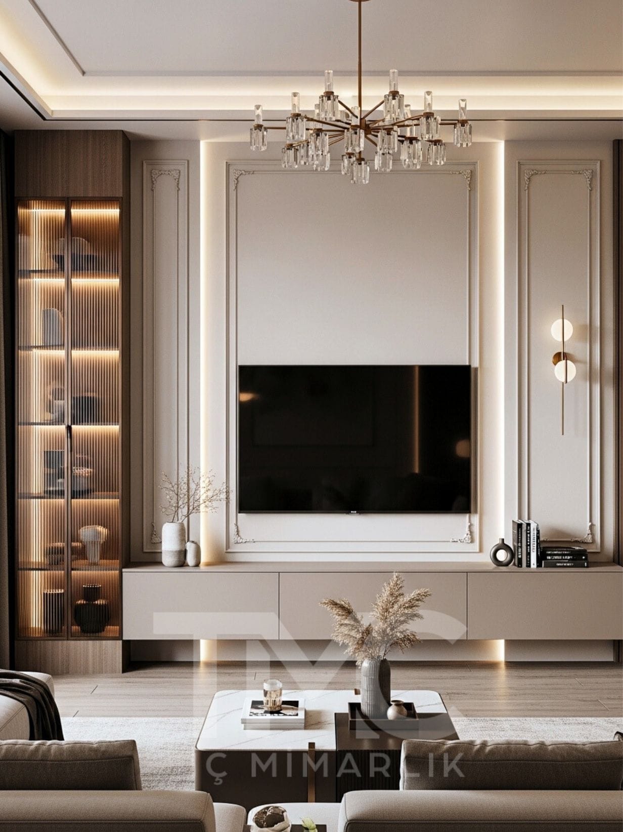 Bu projede modern iç mimarinin sade ve zarif çizgileri, sıcak aydınlatma detayları ile bir araya getirilerek estetik ve dengeli bir yaşam alanı oluşturulmuştur. TV ünitesi tasarımında kullanılan minimal duvar panelleri, bronz tonlu detaylar ve nervürlü cam vitrin uygulaması mekâna hem şıklık hem de derinlik kazandırmaktadır.