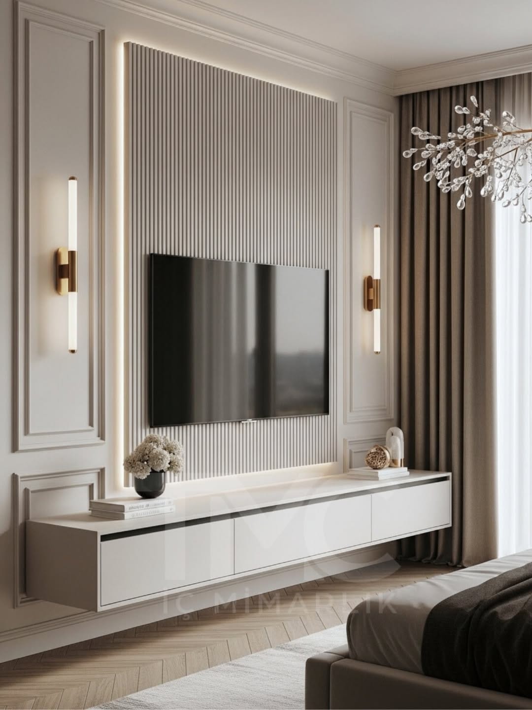 TMC Mimarlık tarafından tasarlanan bu modern TV ünitesi projesi, vizon tonlarının sıcak ve zarif etkisini minimal çizgilerle bir araya getirerek salon dekorasyonuna güçlü bir karakter kazandırıyor. Duvar boyunca uzanan panel tasarımı ve entegre LED aydınlatma detayları sayesinde hem estetik hem de fonksiyonel bir yaşam alanı oluşturulmuştur.
