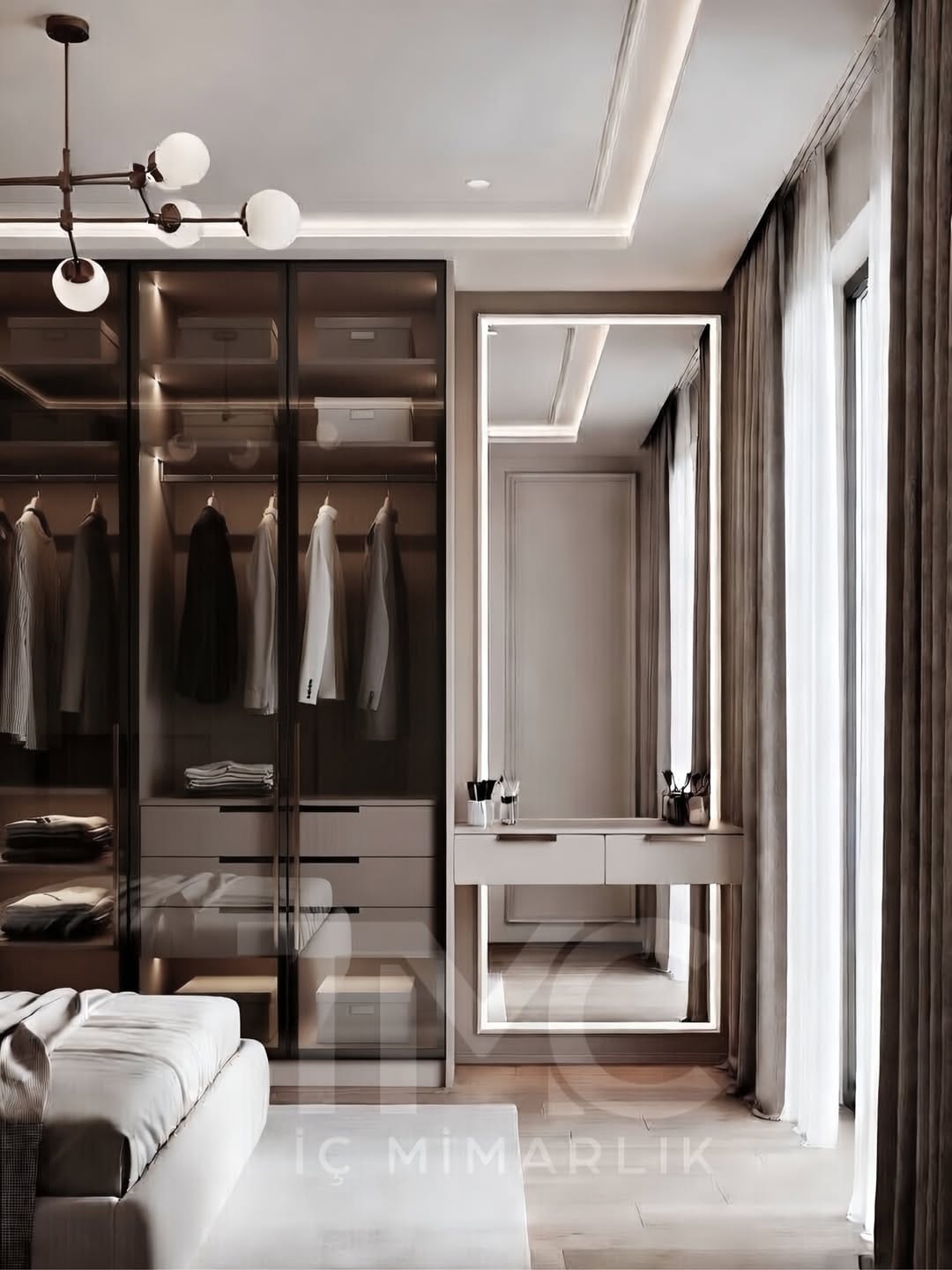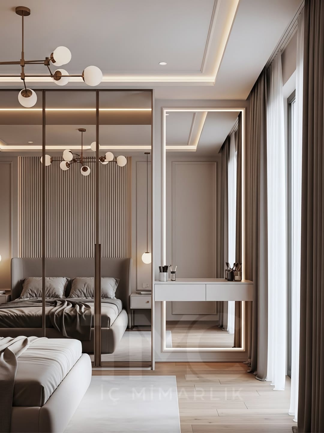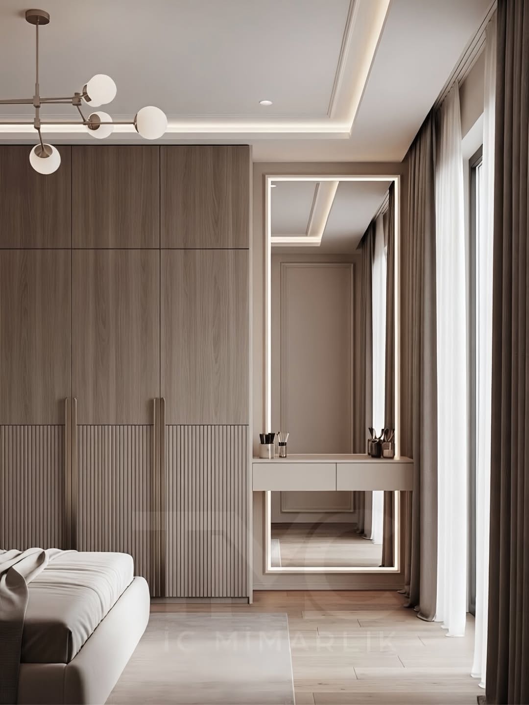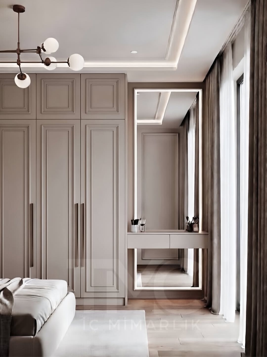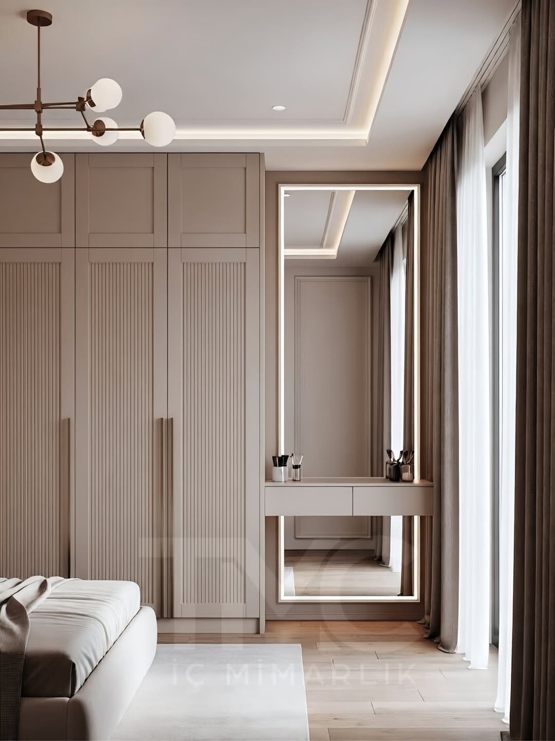 Moonline Suite projesi, sade çizgiler ve dengeli tonların uyumuyla tasarlanmış modern bir giyinme alanı konseptidir. Vizon renk paleti, gizli kulp detayları ve nervür cam yüzey alternatifleri ile mekâna hem estetik hem de fonksiyonel bir değer kazandırılmıştır. LED aydınlatmalı makyaj alanı, kullanıcı konforunu artırırken modern ve zamansız bir atmosfer oluşturur.