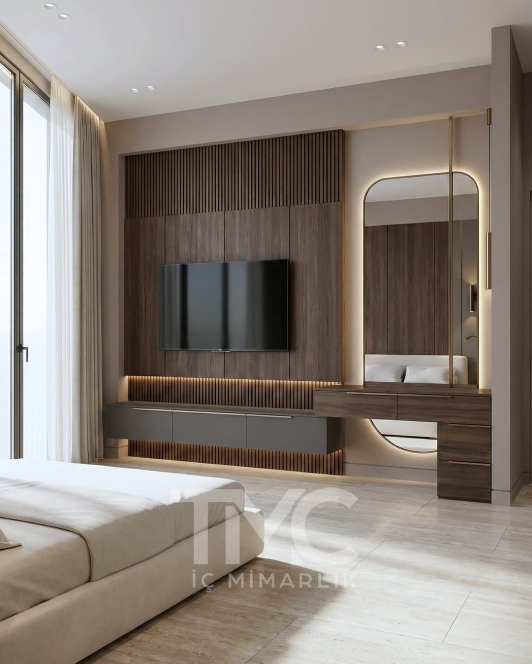 Nordline Suite Projesi kapsamında tasarlanan bu modern yatak odasında; sıcak ahşap dokular, minimal çizgiler ve dengeli LED aydınlatma detayları bir araya getirilerek konfor ve estetik bütünlüğü sağlanmıştır. Mekânın karakterini güçlendiren TV ünitesi, makyaj masası ve duvar panelleri; yalın tasarım anlayışıyla lüks hissini sade bir şekilde yansıtmaktadır.