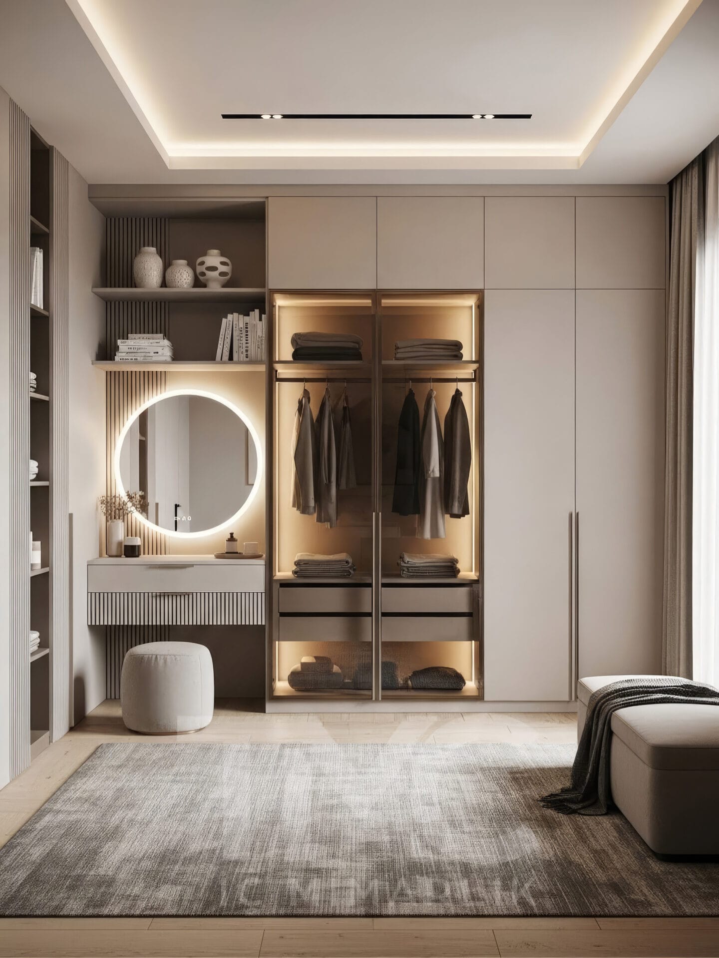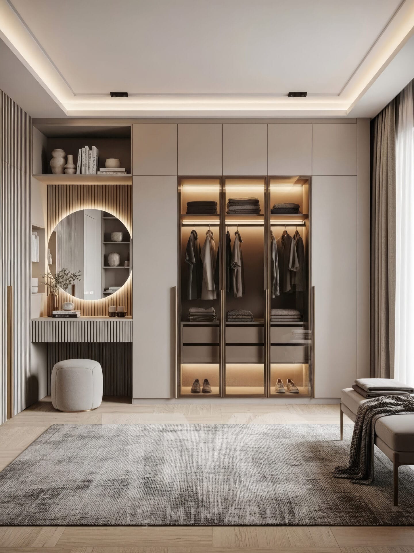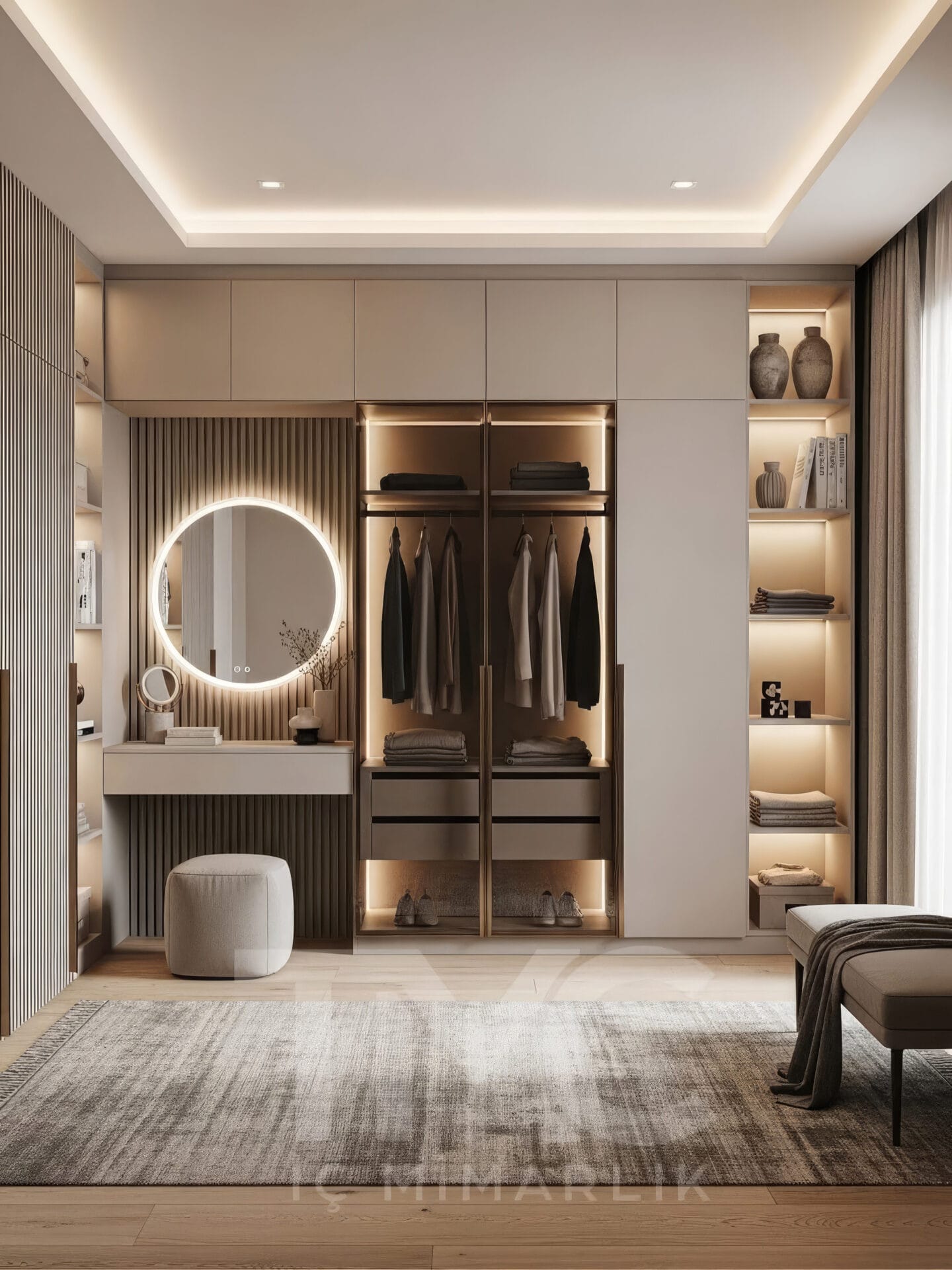 Projede minimal kapaklı dolap modülleri, cam vitrin bölümleri, LED aydınlatmalı askı alanları ve makyaj köşesi bir bütünlük içinde planlanmıştır. Açık tonlu yüzeyler, bronz çerçeveli cam detaylar ve doğal dokulu ahşap raflar sayesinde mekânda sıcak ve zarif bir ambiyans oluşturulmuştur.