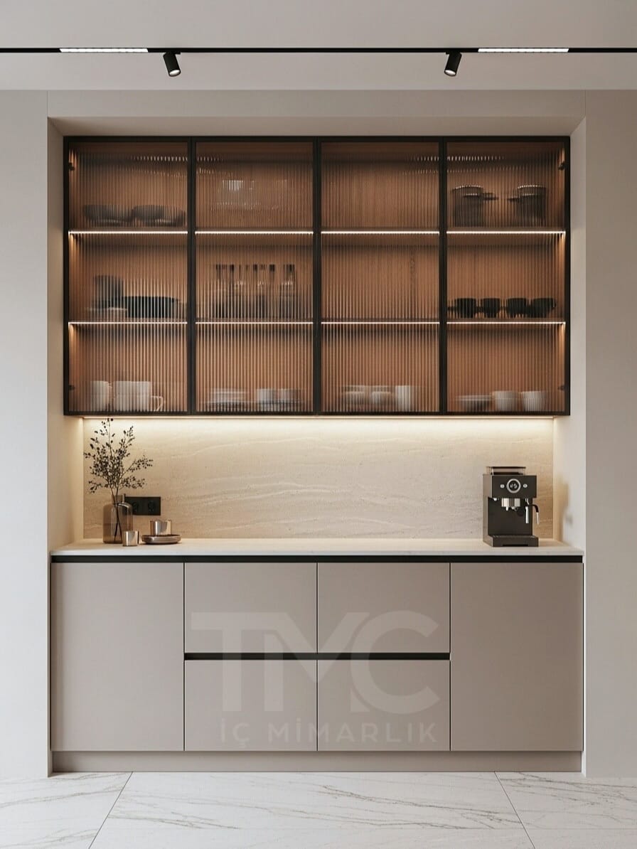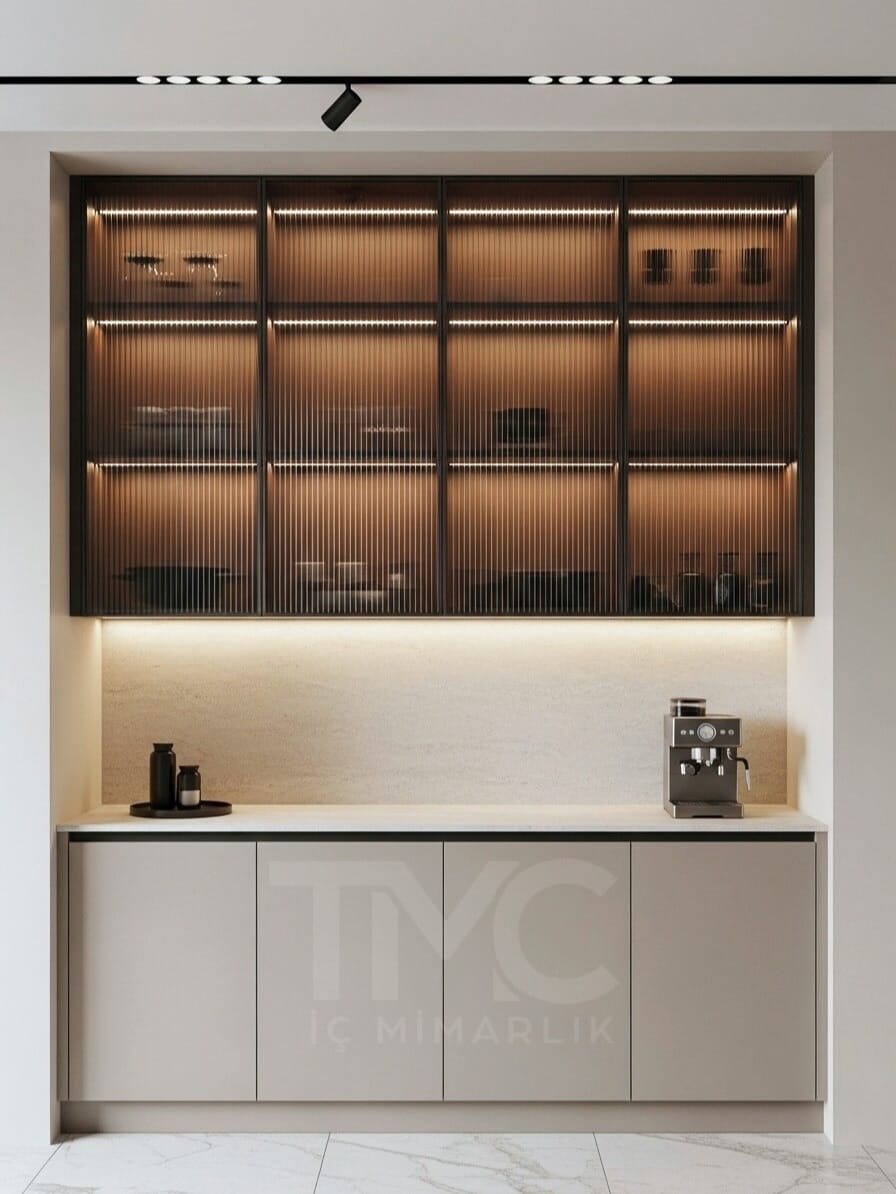 Minimal çizgiler, sıcak detaylar ve işlevselliği bir araya getiren bu özel tasarım mutfak projesinde; fluted cam kapaklı üst dolaplar, yumuşak tonlarda lake yüzeyler ve gizli LED aydınlatmalar ile modern bir bütünlük oluşturuldu. Mutfakla uyumlu şekilde tasarlanan kahve köşesi ise mekâna hem estetik hem de günlük kullanım kolaylığı kazandırıyor.